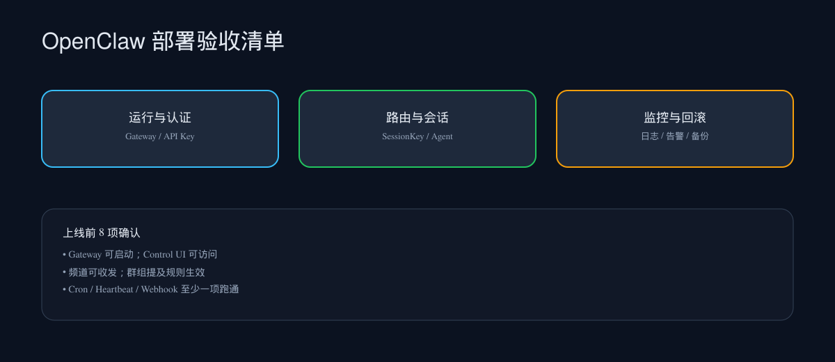 OpenClaw 的上线不是一次性部署,而是“持续运行系统”。 用清单做验收,能有效避免隐形故障与上线翻车。